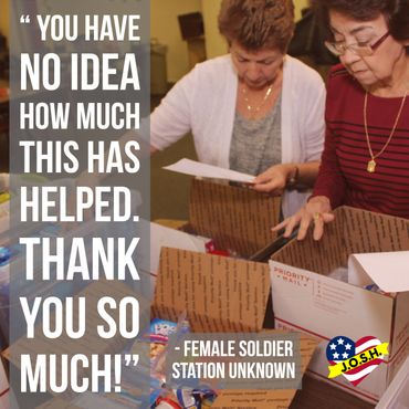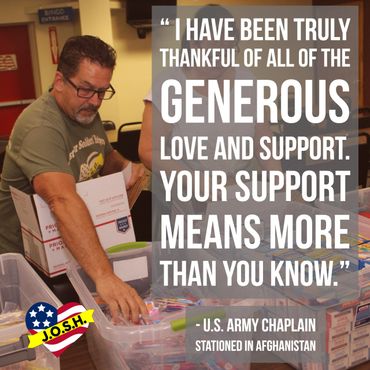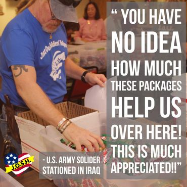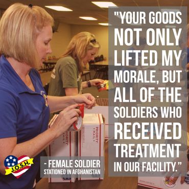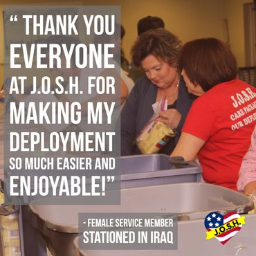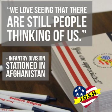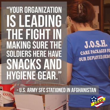 The mission of Just Our Soldiers' Helpers (JOSH), is to increase the morale of deployed U.S. service members from all branches of the military. We do this by providing to them care packages containing name brand items that are not readily available during deployment.